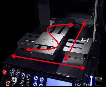 X軸(横)Y軸(縦)のステージが自動連動して大きなロゴやテキストなどのマーキングや切断を可能にします。